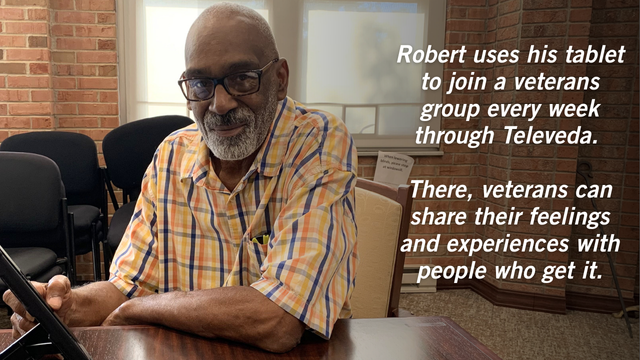 He also uses his tablet to join a veterans group through Televeda. Every week, Robert logs on to an hour-long virtual program by vets and for vets. There, veterans can share their feelings and experiences with people who get it.